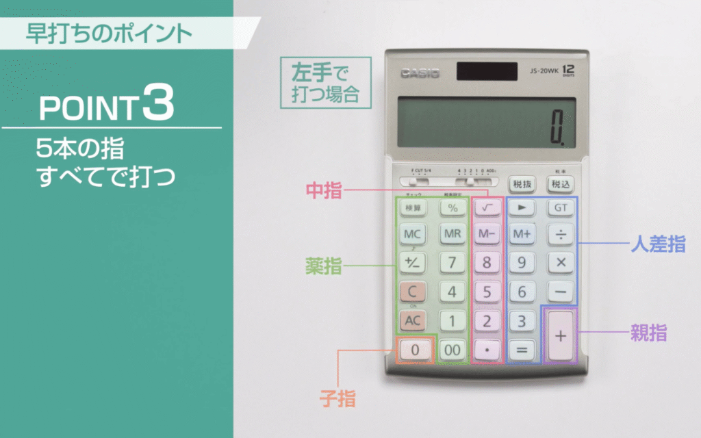 - 手のフォーム:卵型フォーム、指と電卓の距離は1cm以内、手首は浮かせる
